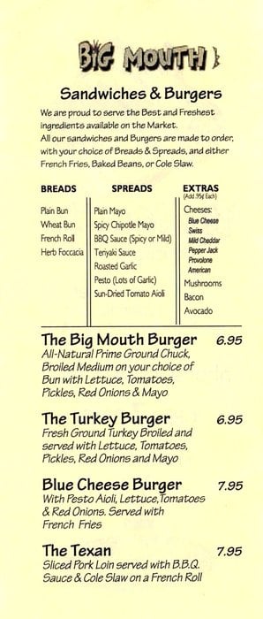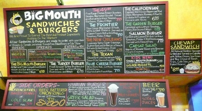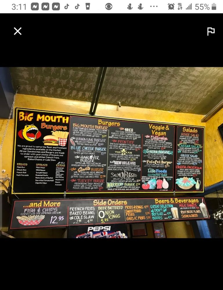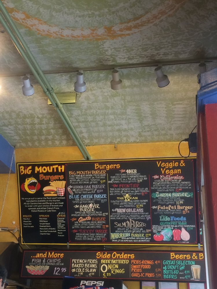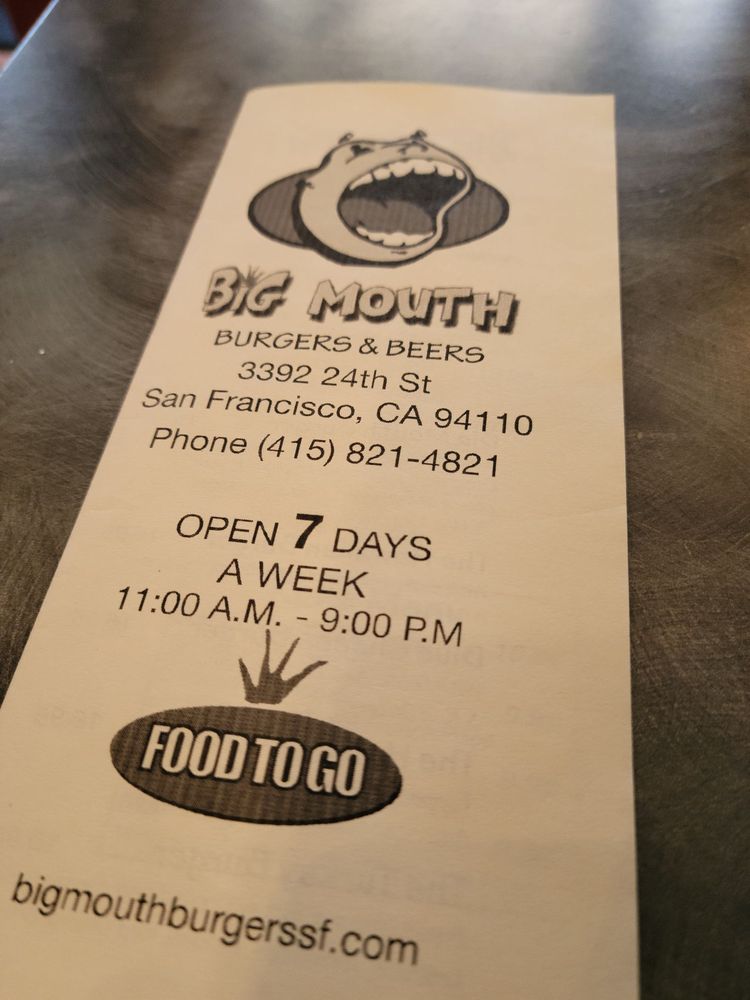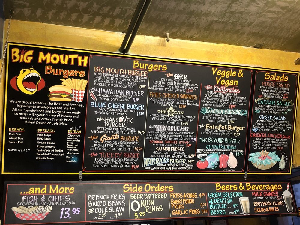Introducing Big Mouth Burgers, a burger joint located at 3392 24th St in San Francisco. Known for its diverse menu offerings, Big Mouth Burgers provides a range of options, including salads like House Salad and Greek Salad, alongside a variety of mouth-watering burgers. Standout items include the Big Mouth Burger with all-natural prime ground chuck, the Hawaiian Burger with grilled pineapple and teriyaki sauce, and the Hangover Burger topped with a fried egg and bacon. For veggie lovers, the Californian Burger with eggplant and red onion marinated in rosemary is a delightful option. Customers rave about the friendly service and the delicious food, making Big Mouth Burgers a must-visit in the city. Don't miss out on their garlic fries and Fish & Chips for a complete dining experience.